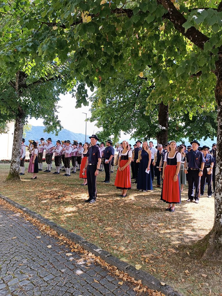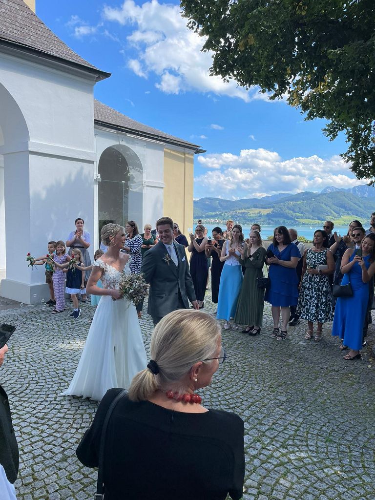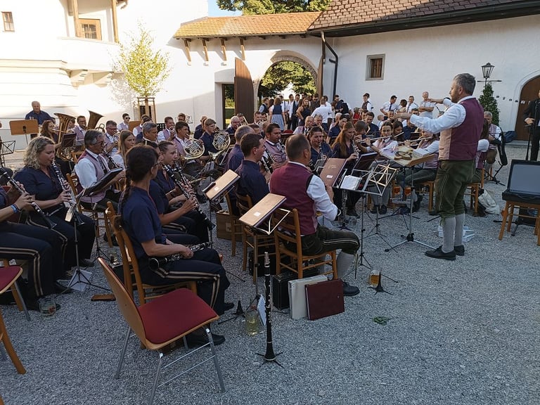 Unser Tenorist Markus heiratete seine Klara (Hornistin in Timelkam) und wir durften mit dabei sein. Nachdem beide bei einem Musikverein sind, war es sogar eine Doppelmusihochzeit und wir vermischten uns mit der Marktmusik Timelkam um gemeinsam die Hochzeitsgäste in Attersee zu empfangen. Auch im Schloss Stauf gaben wir ein gemeinsames Konzert. Natürlich durfte das Stück mit dem Brautpaar auch nicht fehlen.